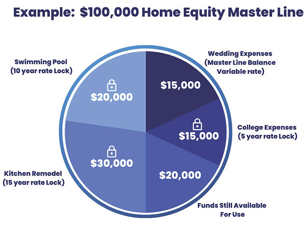 With a Master Line, you can lock portions of your line at a fixed rate as you go. For special projects, like a pool, wedding, or kitchen remodel, you can fix those loans under one line of credit, while still retaining the ability to use the remaining line for other needs. See the example below.